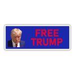 - Bold Design: The striking design features a vivid blue background, a detailed image of Trump, and the text “FREE TRUMP” in bold, eye-catching red letters.