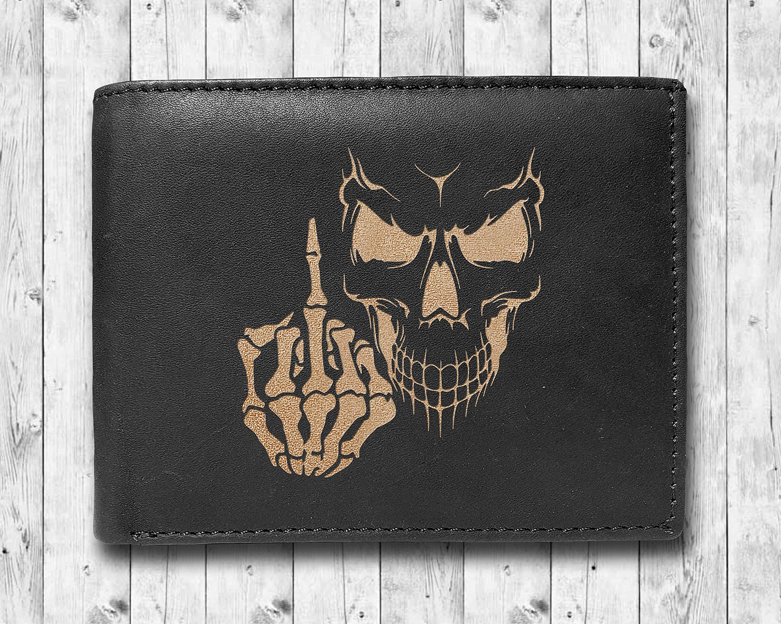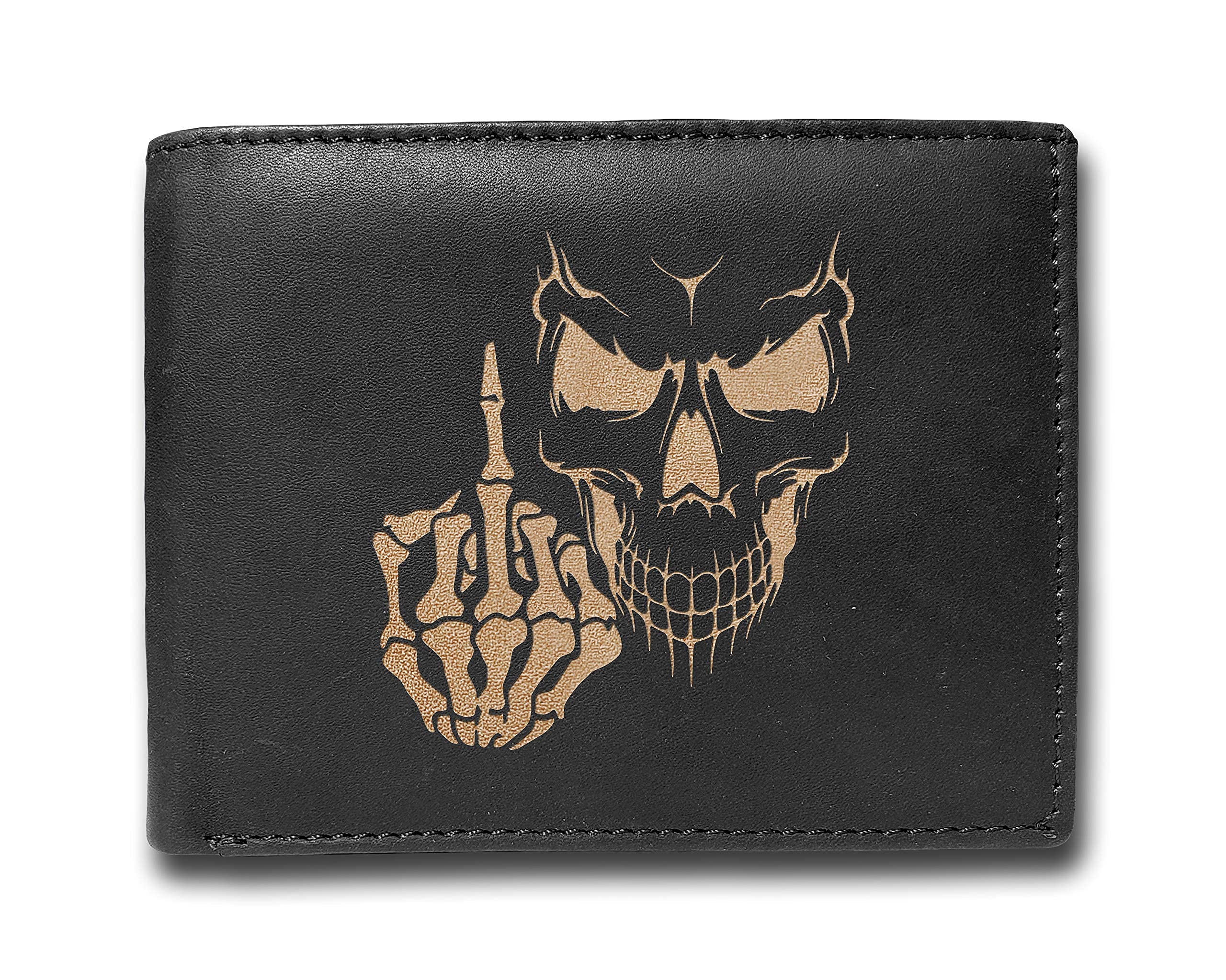 Home Engraved Leather Wallet eDesign USA Middle Finger Skull Cowhide Leather Laser Engraved Engraving Slimfold Mens Large Capacity Luxury Wallet Purse Minimalist Sleek and Slim BLACK Credit Card Holder Organizer 14 Pockets